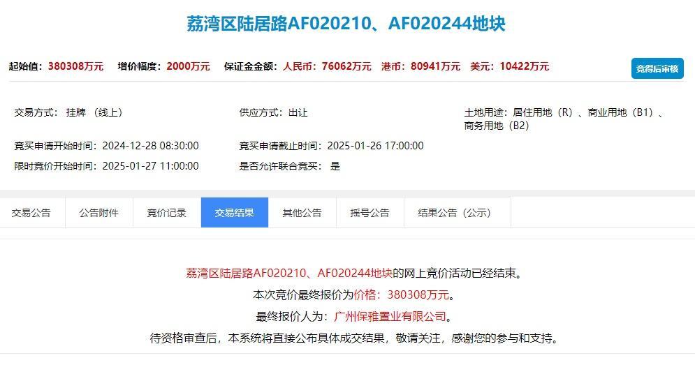 1月27日上昼,保利置业以38亿元底价竞得广州荔湾陆居路AF020210、AF020244地块,折合楼面价2.4万元/㎡。这是继三天前国企越秀地产8.8亿元拿下海珠区AH020216地块之后,又一央企加抓广州。
